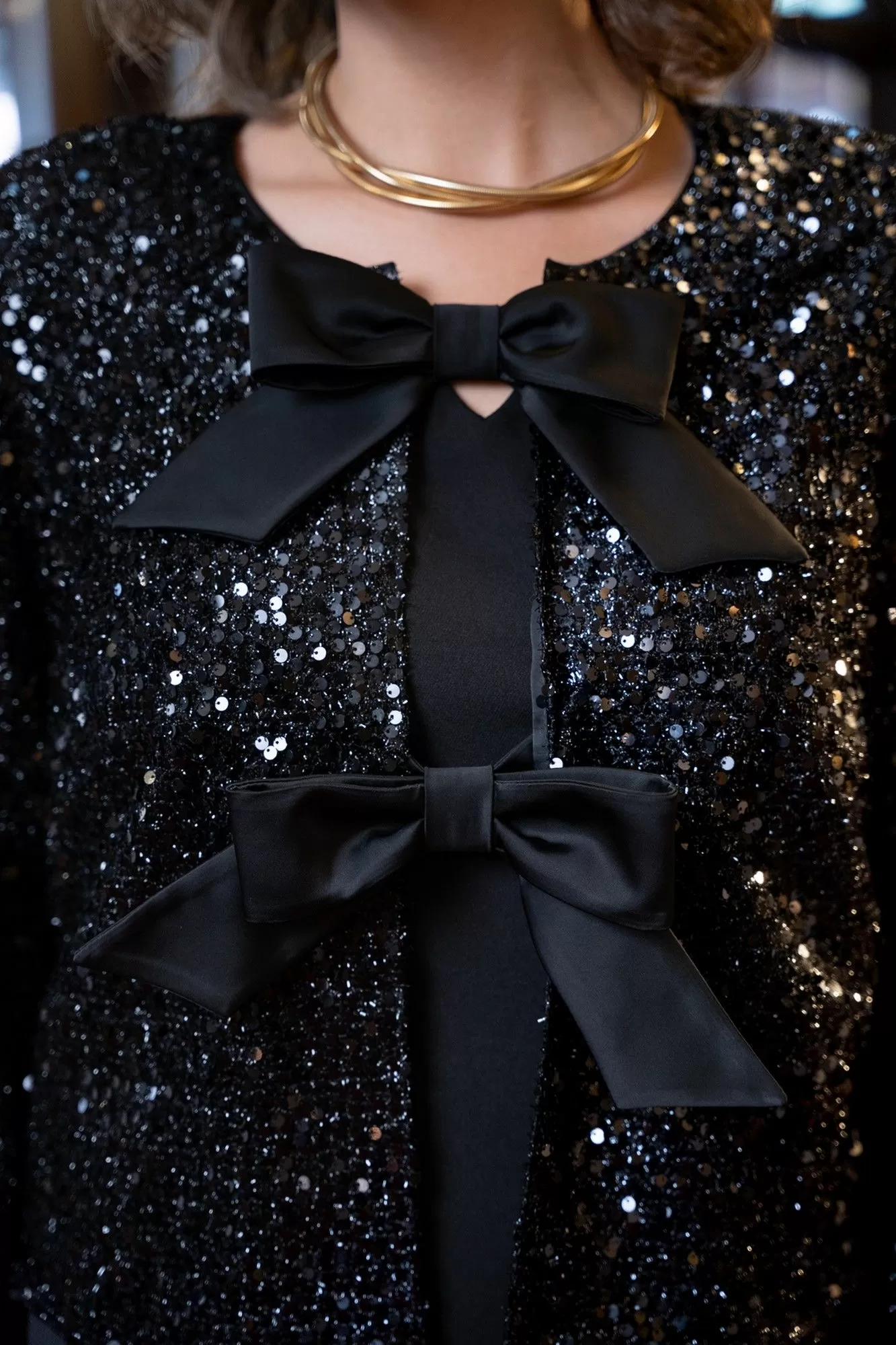 Комплект женский состоит из укороченного жакета из полотна с пайетками и платья.Жакет прямого силуэта свободного покроя с естественной линией плеча на подкладке из атласной ткани.Горловина округлой формы.БАНТЫ СЪЁМНЫЕ!Застежка на съемные декоративные авторские банты с применением потайного крепления на небольшие кнопки, для возможности создания различных образов, как с бантами, так и без них.Платье женское полуприлегающего силуэта с естественной линией плеча.Рукав короткий втачной одношовный.Горловина оригинальной авторской формы.По переду выполнены полурельефы выходящие из пройм.Спинка с вытачками.В среднем шве спинки застежка на потайную тесьму-молнию и шлица.