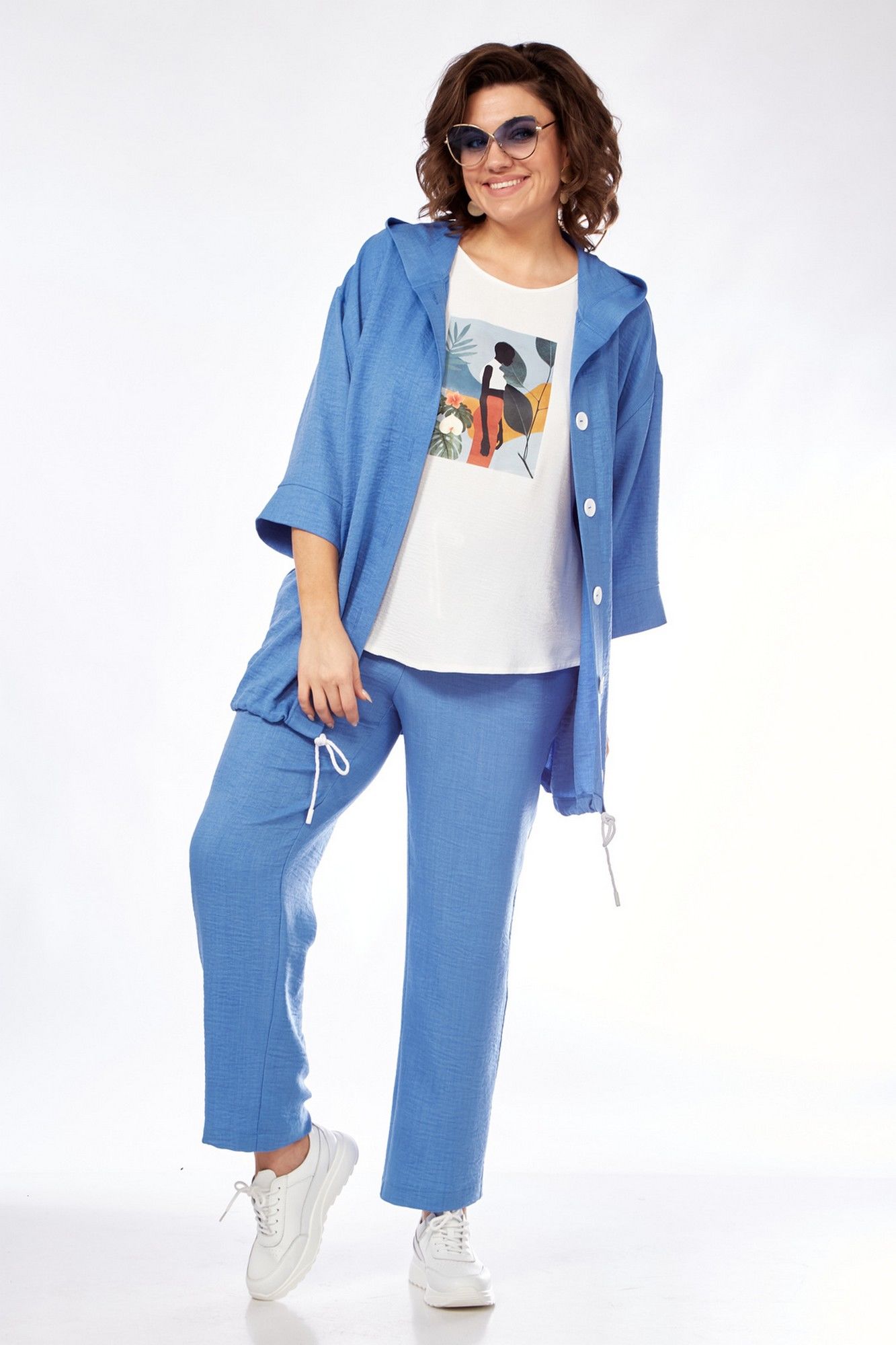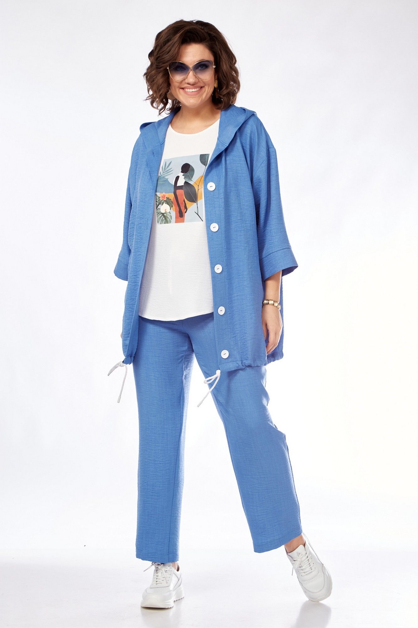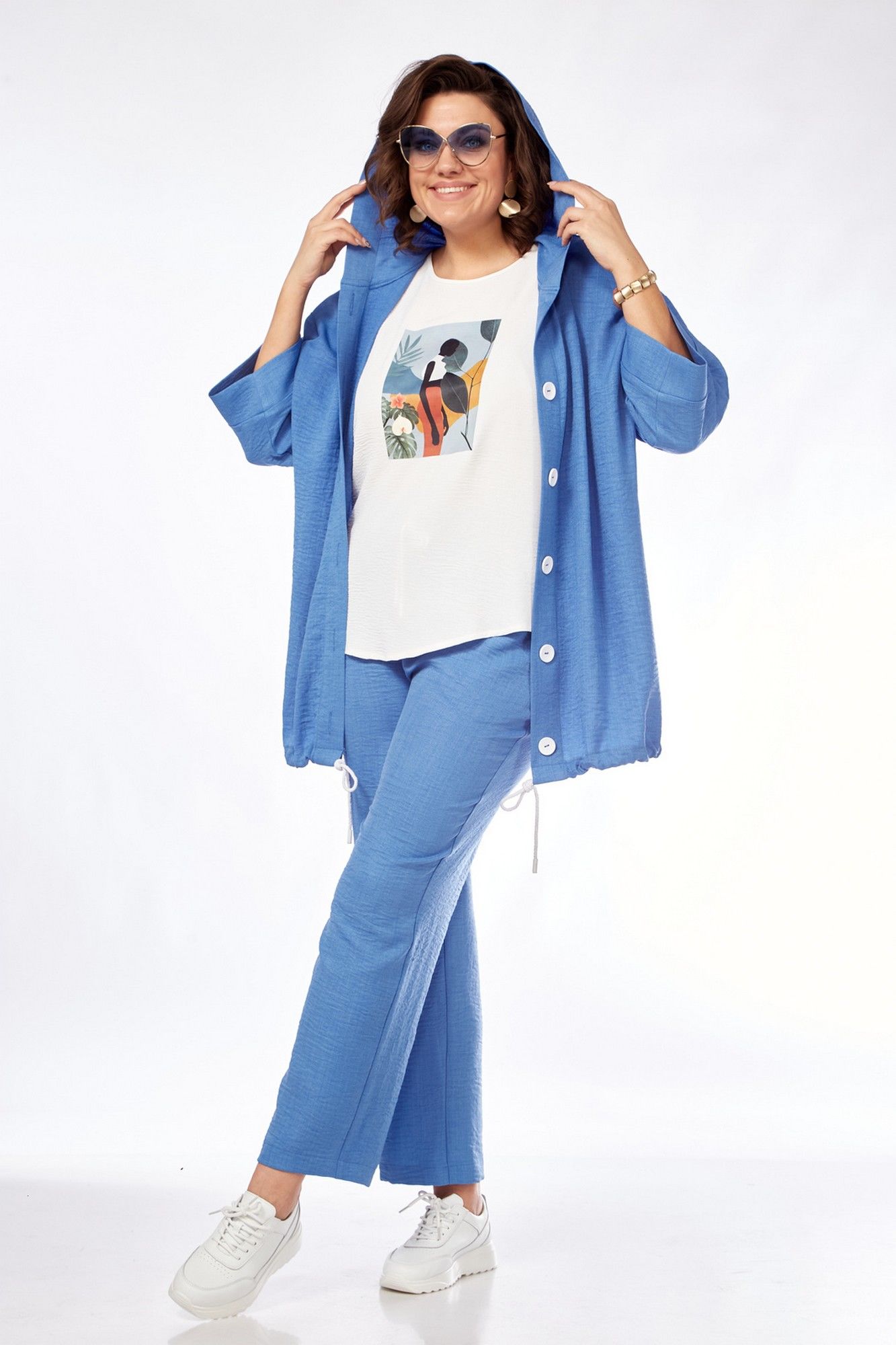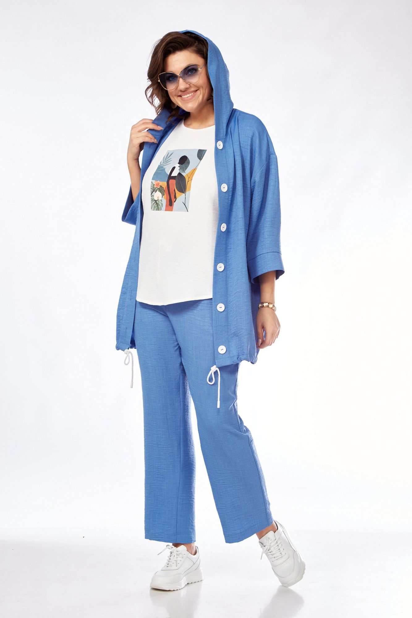 Костюм женский состоит из бомбера, топа и брюк. Бомбер свободного покроя со спущенной линией плеча. Центральная застёжка на петли пуговицы. В горловину вставлен капюшон. Низ бомбера с кулисой и шнуром. Рукав длиной 3/4 с манжетой. Топ свободного покроя. Горловина округлой формы, окантована. Рукав спущенный цельнокроеный. Брюки свободные прямого силуэта. Пояс притачной на резинке, регулируется шнуром с наконечниками. В боковых швах карманы.