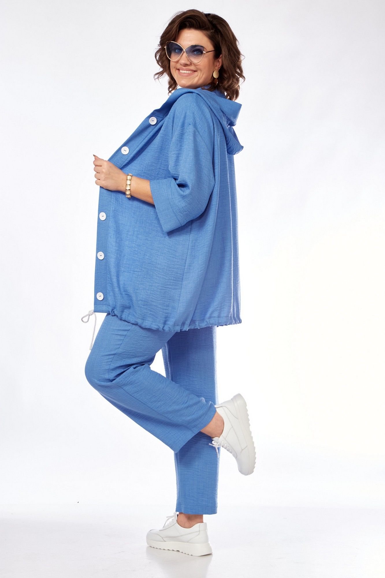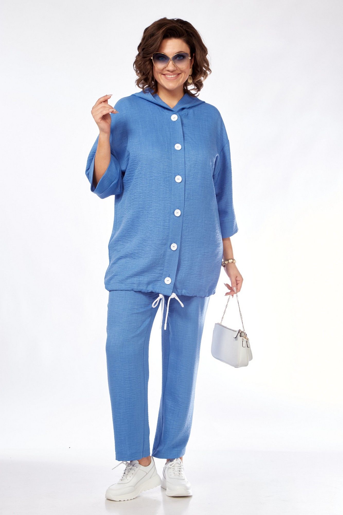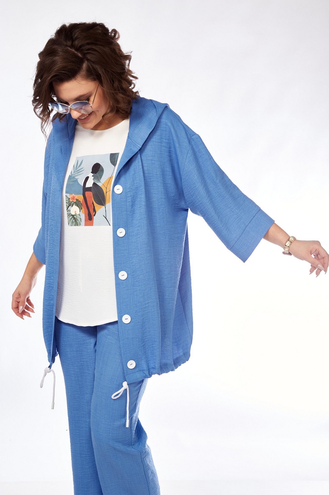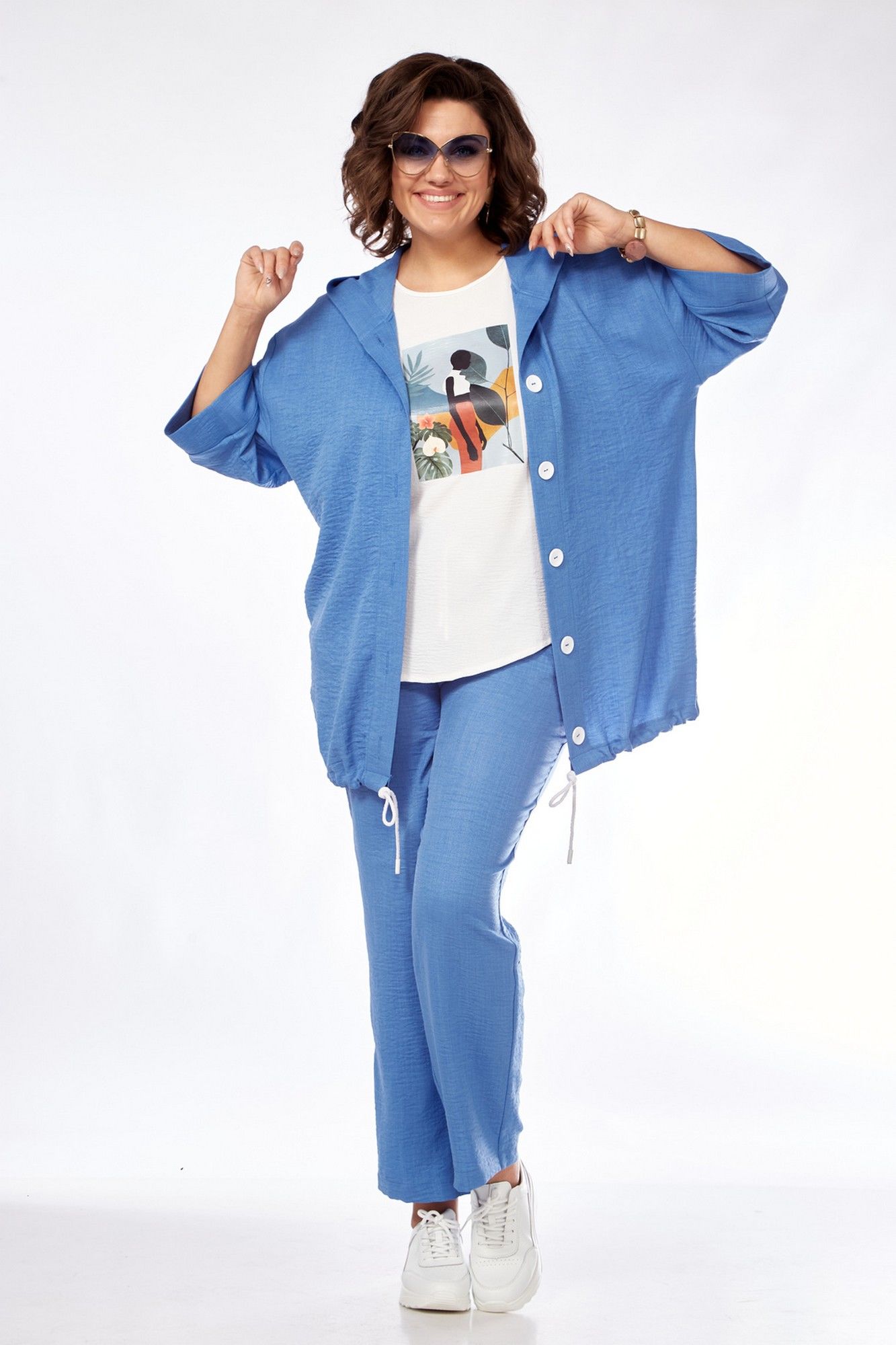 Костюм женский состоит из бомбера, топа и брюк. Бомбер свободного покроя со спущенной линией плеча. Центральная застёжка на петли пуговицы. В горловину вставлен капюшон. Низ бомбера с кулисой и шнуром. Рукав длиной 3/4 с манжетой. Топ свободного покроя. Горловина округлой формы, окантована. Рукав спущенный цельнокроеный. Брюки свободные прямого силуэта. Пояс притачной на резинке, регулируется шнуром с наконечниками. В боковых швах карманы.