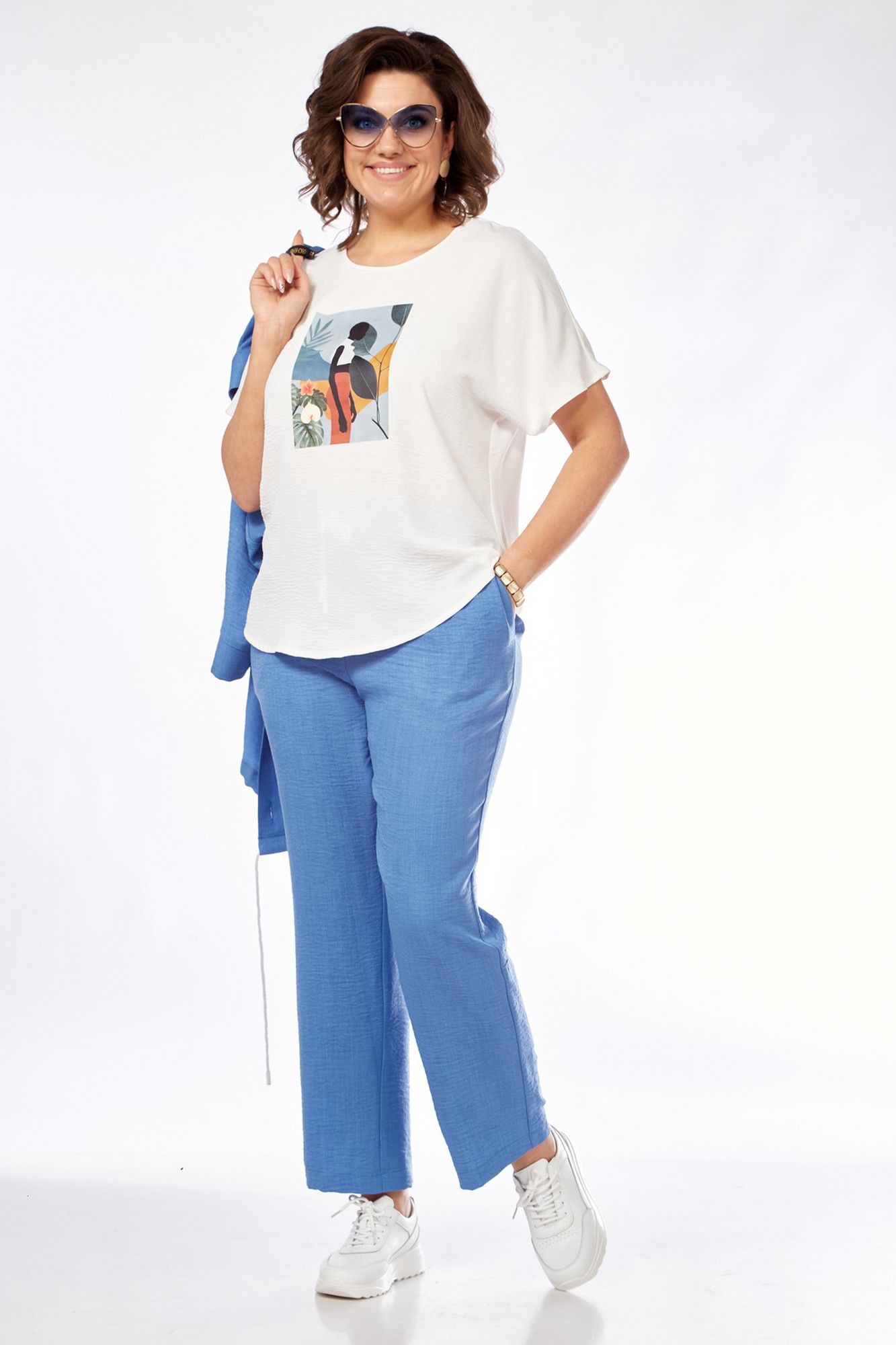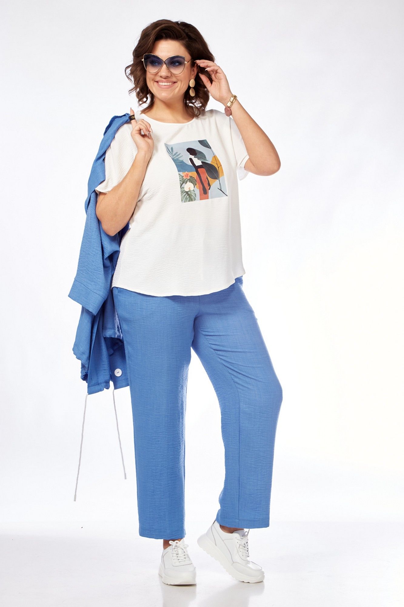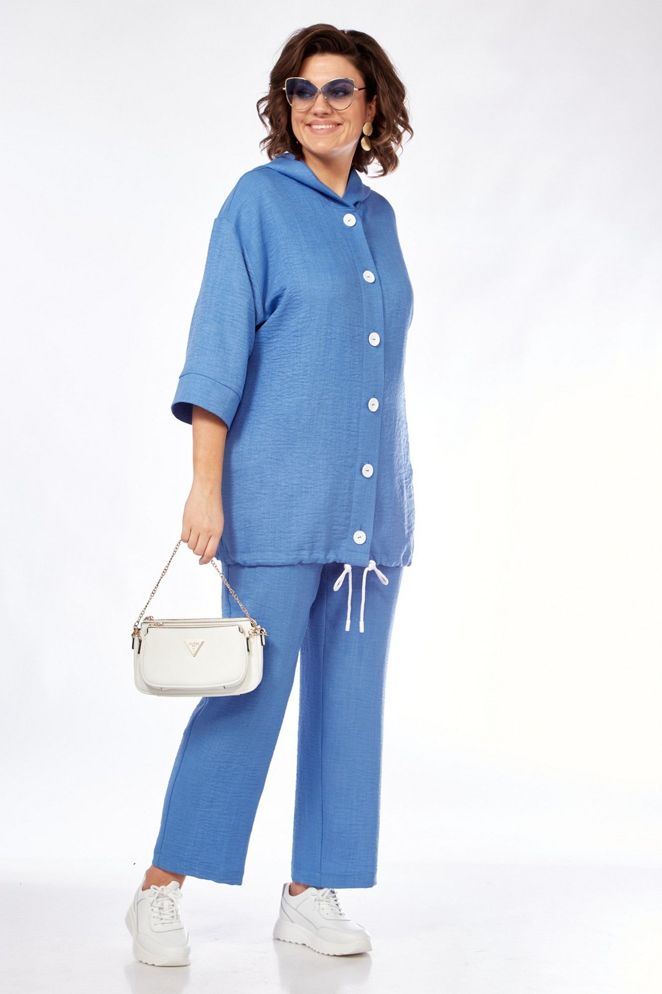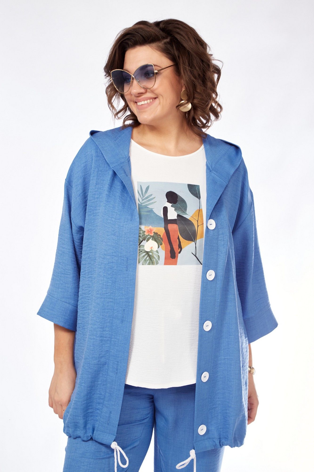Костюм женский состоит из бомбера, топа и брюк. Бомбер свободного покроя со спущенной линией плеча. Центральная застёжка на петли пуговицы. В горловину вставлен капюшон. Низ бомбера с кулисой и шнуром. Рукав длиной 3/4 с манжетой. Топ свободного покроя. Горловина округлой формы, окантована. Рукав спущенный цельнокроеный. Брюки свободные прямого силуэта. Пояс притачной на резинке, регулируется шнуром с наконечниками. В боковых швах карманы.