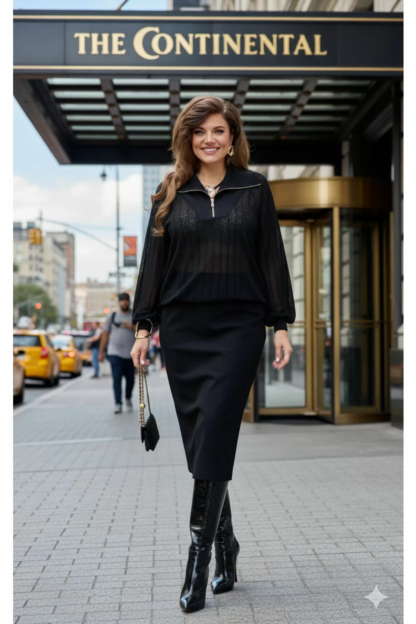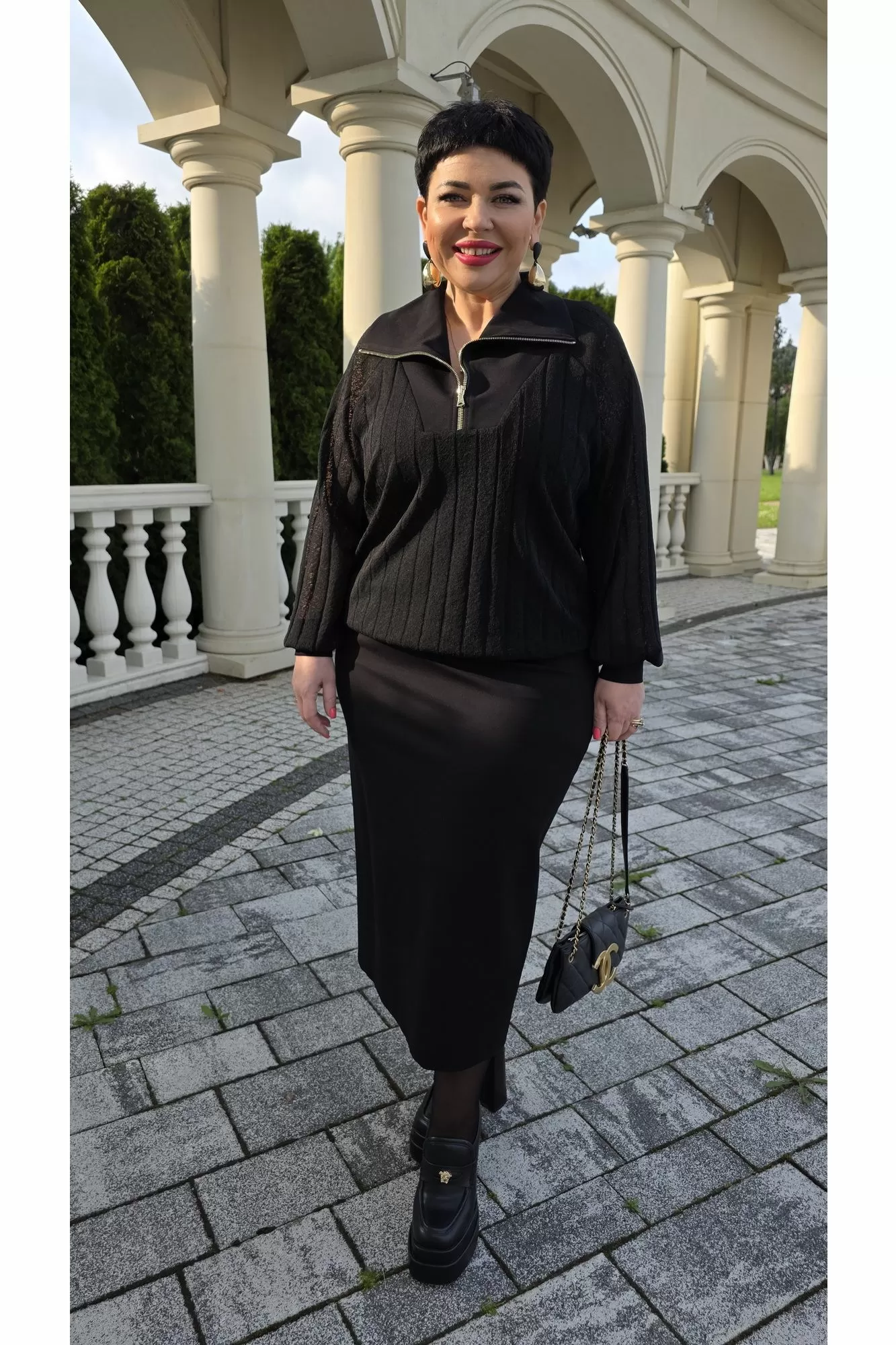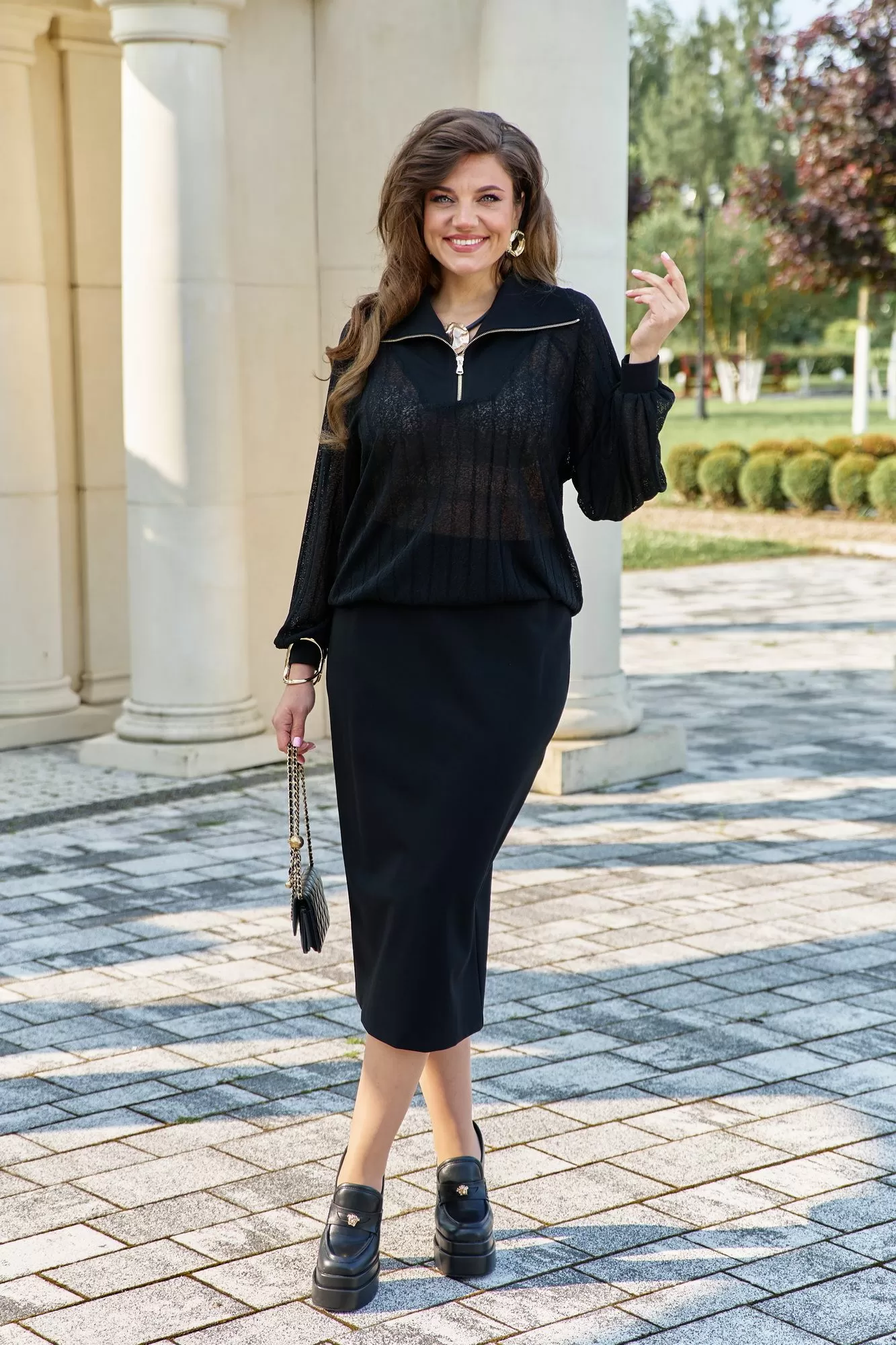 Комплект женский, состоящий из джемпера и юбки. Джемпер (состав: джемпер 100% полиэстер) черного цвета, из полупрозрачного материала, его фактура — эффект гофре — это складки, они играют со светом, то поглощая его, то отпуская, создавая живое, дышащее полотно. Джемпер свободного силуэта, с планкой из отделочного материала переходящей в отложной воротник с застёжкой на декоративную тесьму-молнию. Рукав в джемпере- реглан со сборкой на притачную манжету из отделочной ткани. По спинке джемпера фигурная кокетка из отделочной ткани. Низ со сборкой на эластичную тесьму-резинку. Юбка (состав: 60% вискоза, 35% полиамид, 5% спандекс) прямого силуэта, удлинённая, зауженная книзу. Пояс в юбке притачной со вставкой в бочках декоративной тесьмы-резинки для удобного прилегания. В среднем шве заднего полотнища юбки застёжка на декоративную молнию, и разрез от низа. Обращаем Ваше внимание, что фурнитура может незначительно отличаться от фото. Длина джемпера 67 см (р 50-54), 67,5 см (р 56-60), длина рукава 64 см (р 50-54), 65 см (р 56-60). Длина юбки 81 см.