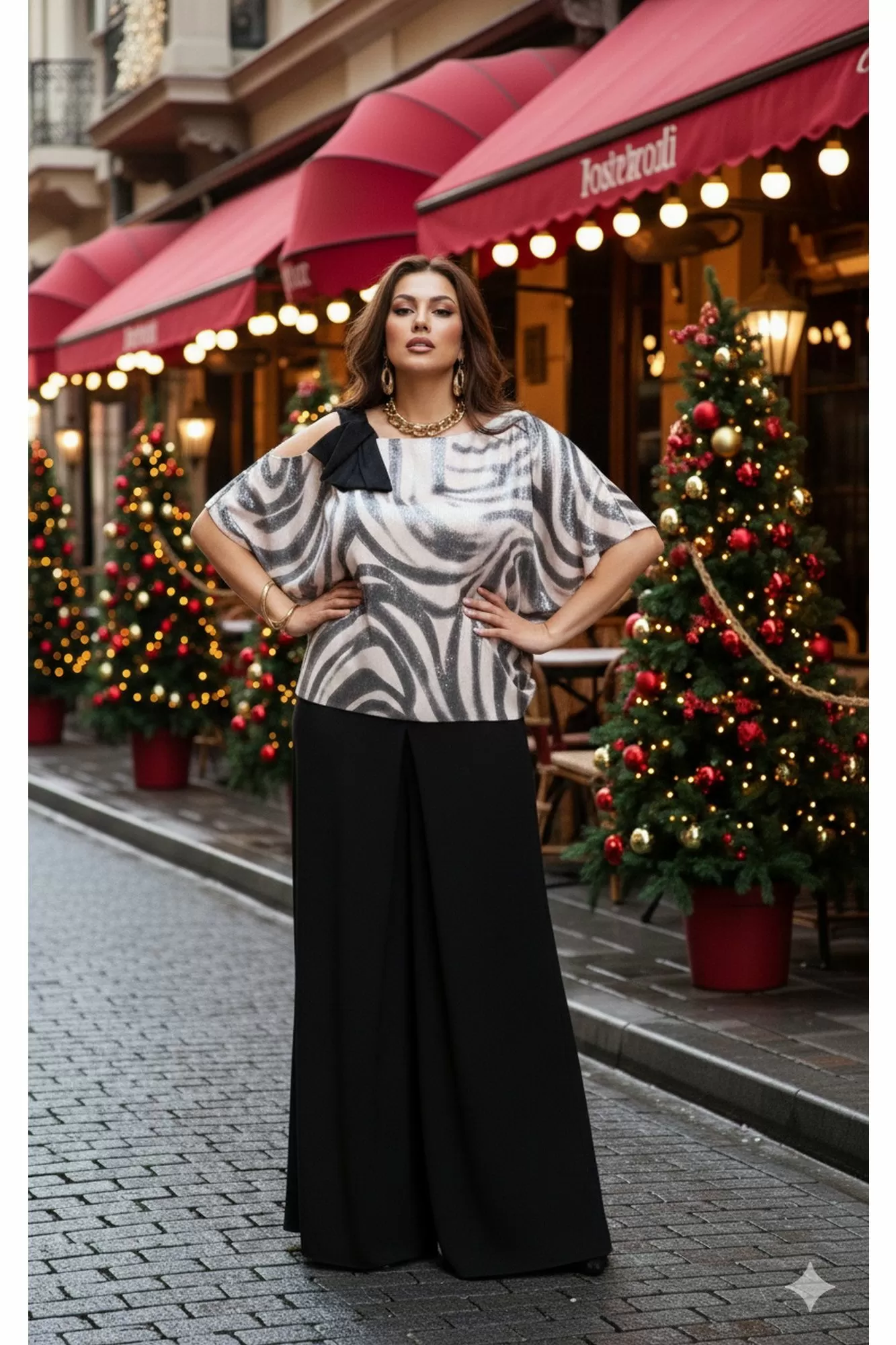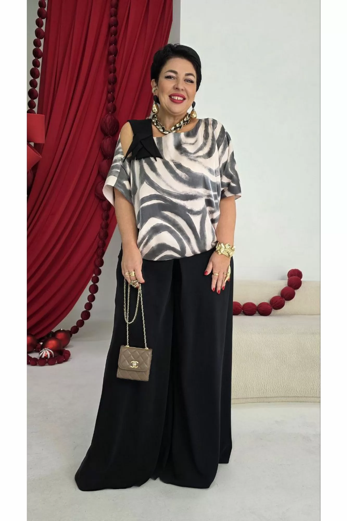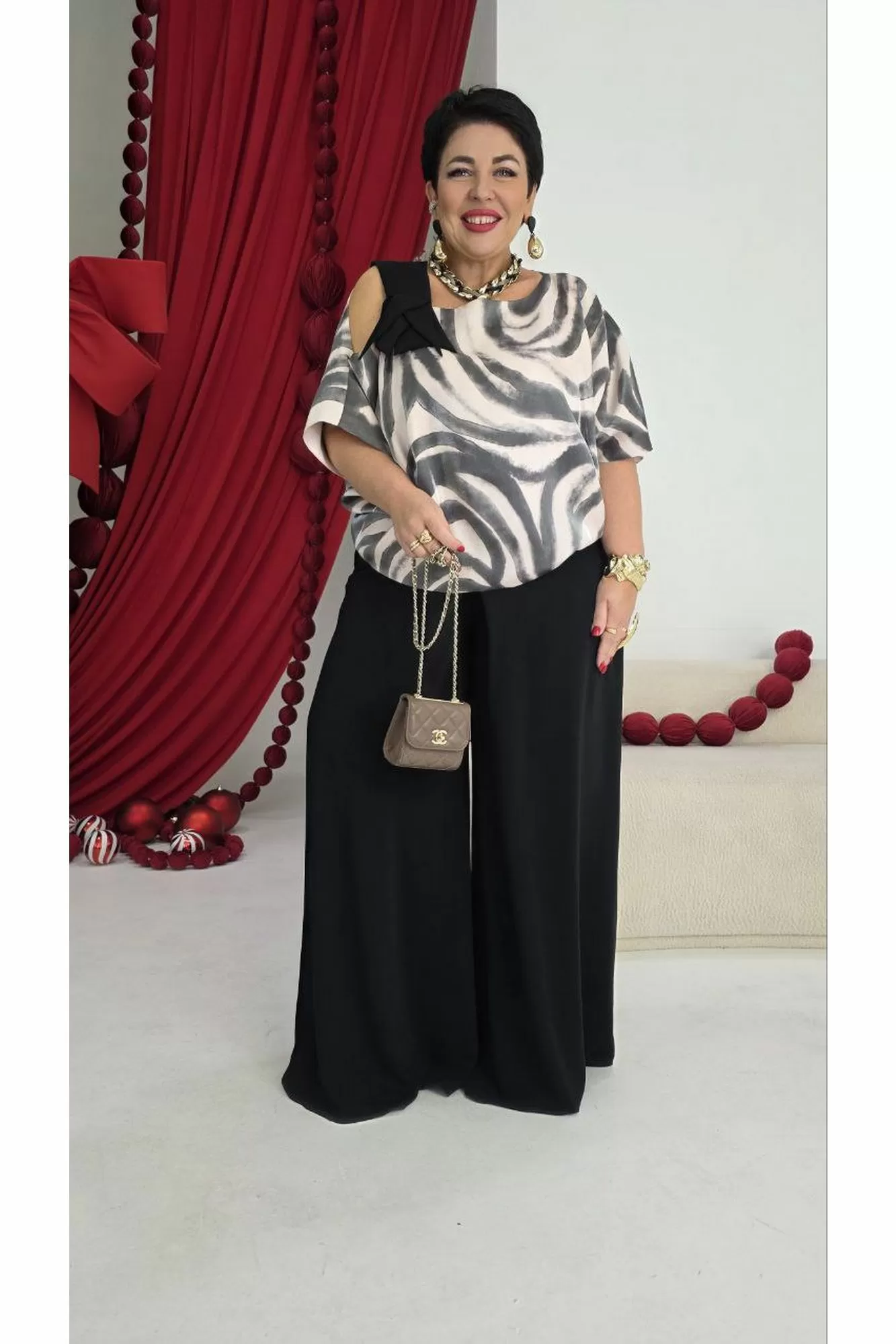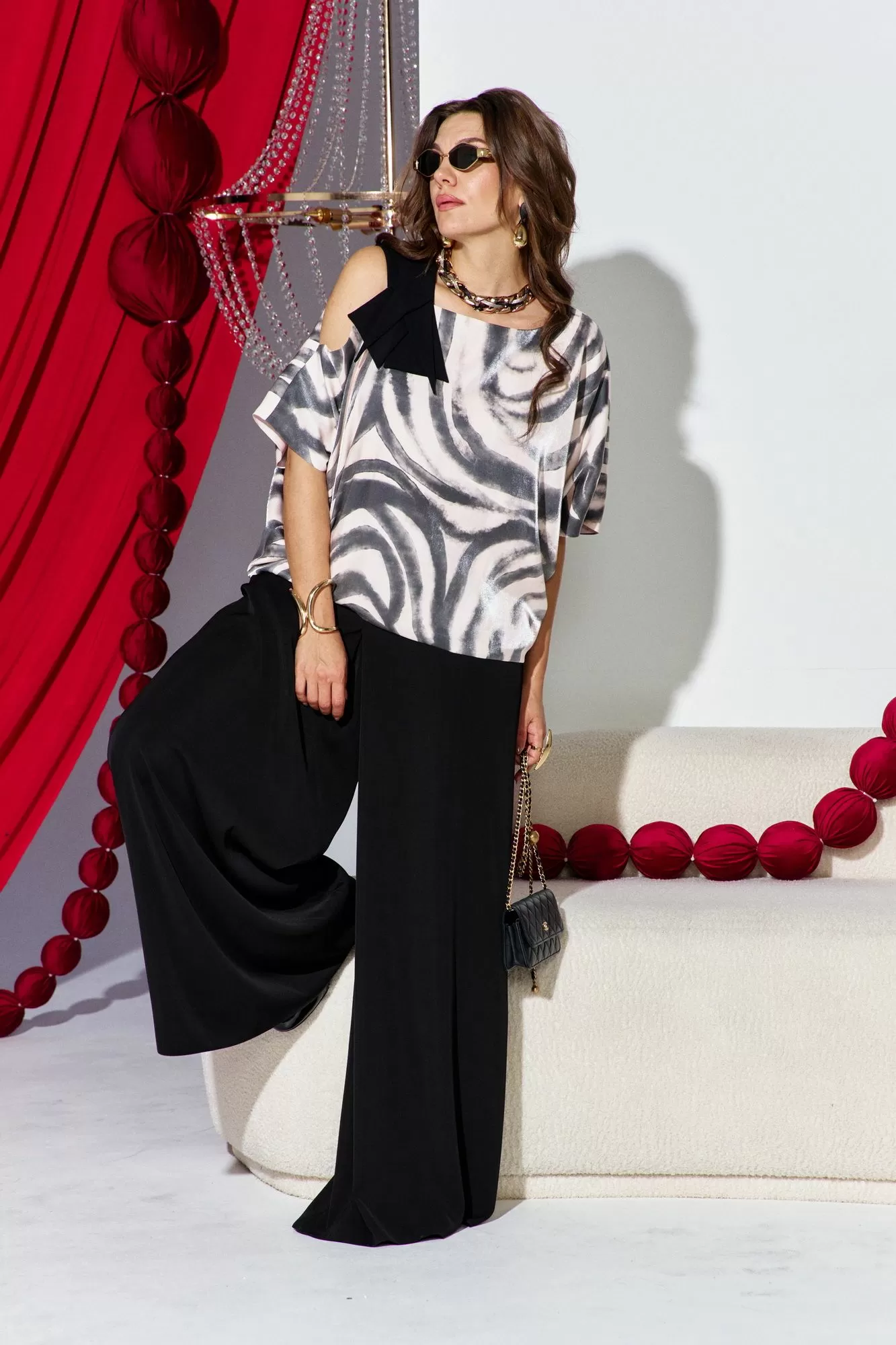 Это стильный и современный ансамбль, который состоит из блузы и брюк. Изысканный женский комплект идеален для торжественных мероприятий, он станет жемчужиной вашего гардероба. Брючный комплект можно дополнить минималистичными украшениями, которые подчеркнут утончённость, завершая этот элегантный, но уверенный образ.Блуза (состав: 61% район, 39% вискоза) свободного силуэта с асимметричной формой горловины: одно плечо открыто, расположен декоративный элемент чёрного цвета из отделочной ткани. Рукав цельнокроеный. Спинка без особенностей. Блуза на подкладке. Брюки (состав: 100% полиэстер) свободного кроя выполнены из плотной, матовой ткани чёрного цвета. Их широкий фасон и высокая посадка на талии создают элегантный и удлинённый силуэт, а также контрастируют с лёгким и воздушным верхом. Пояс в брюках притачной со вставкой эластичной тесьмы-резинки в бочках. По переду брюк от пояса застрачивается складка. В среднем шве брюк застёжка на потайную тесьму молнию и пуговицу в поясе. Длина блузы 56,5 см (р 52-56), 57,5 см (р 58-62), длина рукава 36,5 см (р 52-56), 37,5 см (р 58-62). Длина брюк 108 см.