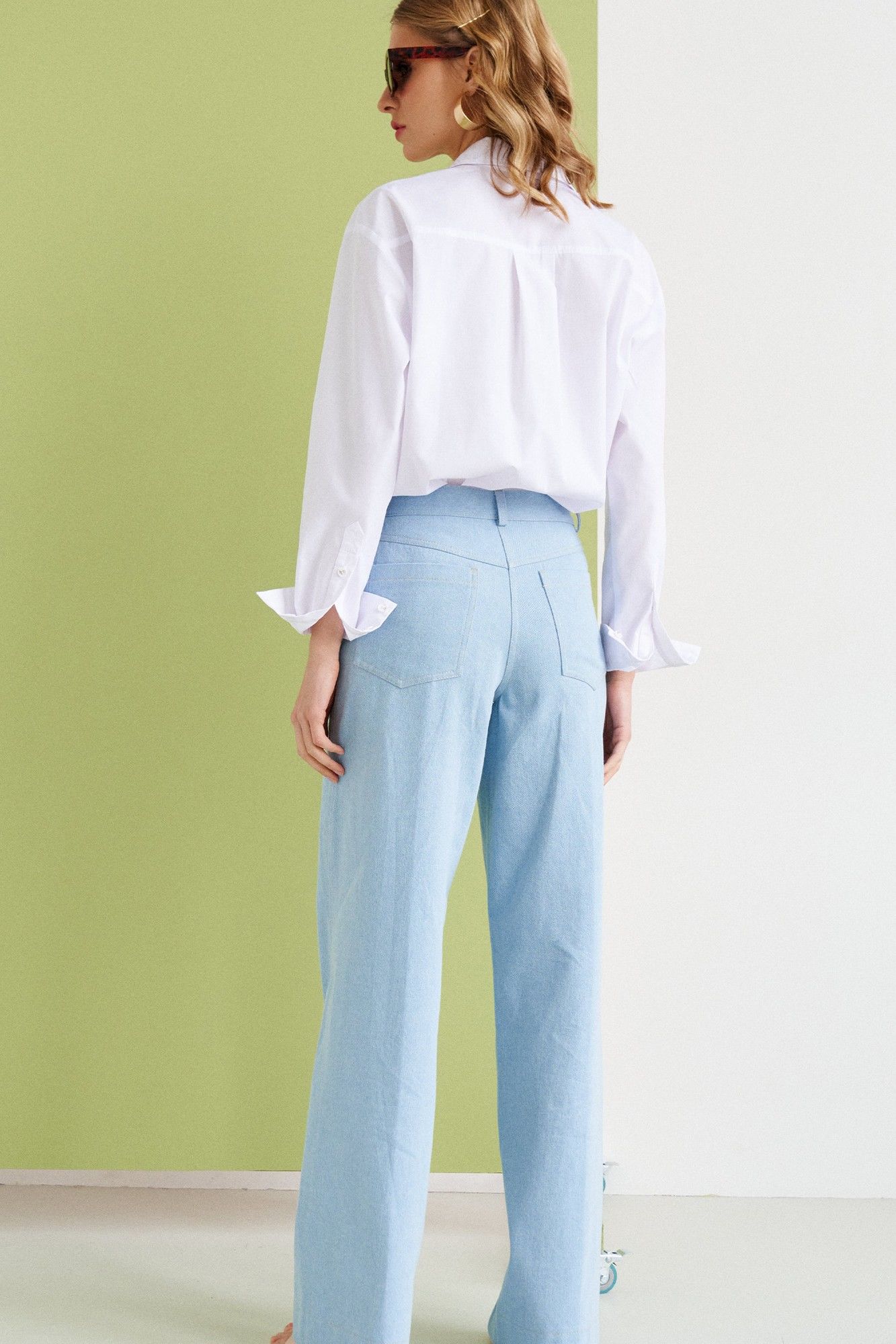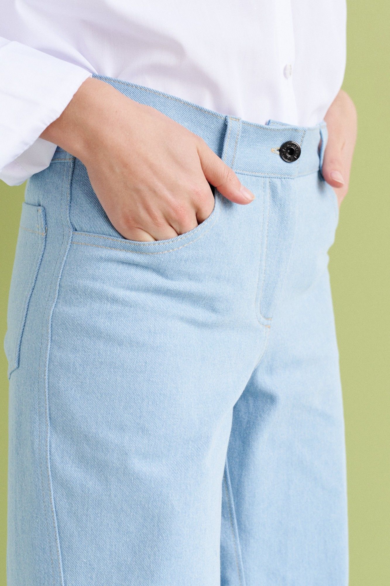 Брюки женские, на притачном поясе с шлевками. По переду наклонные карманы с притачными планками. Выполнены из джинсовой ткани. Изделие на притачном поясе. По переду располагаются карманы. А также застежка с гульфиком и откоском, на притачной тесьме- молнии. По задним половинкам располагается кокетка и накладные карманы. Рост модели на фотографии 173 см., размер 42. Параметры модели ОГ-86см., ОТ-60см., ОБ-90см.